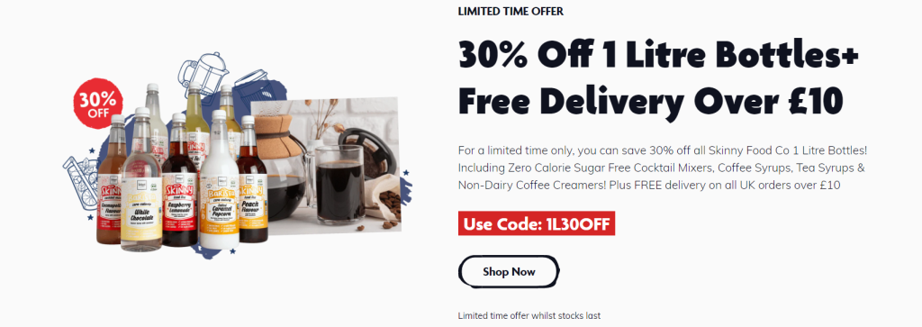 The Skinny Food Co always offer food sales on their products. For example, Now they offer 30% off on all 1 Litre bottles of products like Zero Calorie Sugar-Free Cocktail Mixers and Coffee Syrups. Moreover, there is a 29% off on the healthy ready meals. It is important to check their website frequently to keep up to date with all the lucrative offers they offer, so you can enjoy their products and save money along the way.